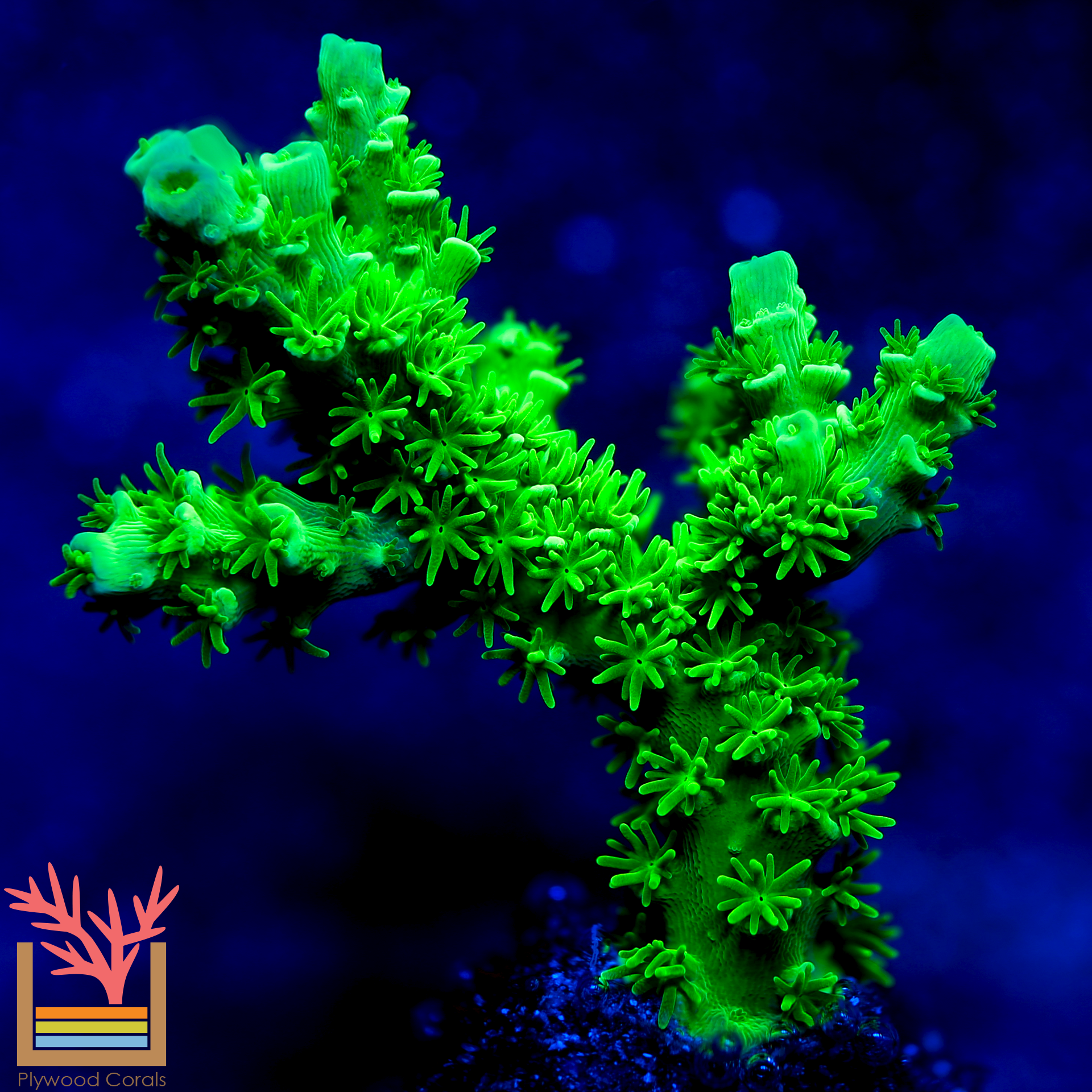 Vibrant Bright Green with very prominent Polyps! This coral grows like a staghorn, so plenty of empty space within the colony...makes for a great accent piece!